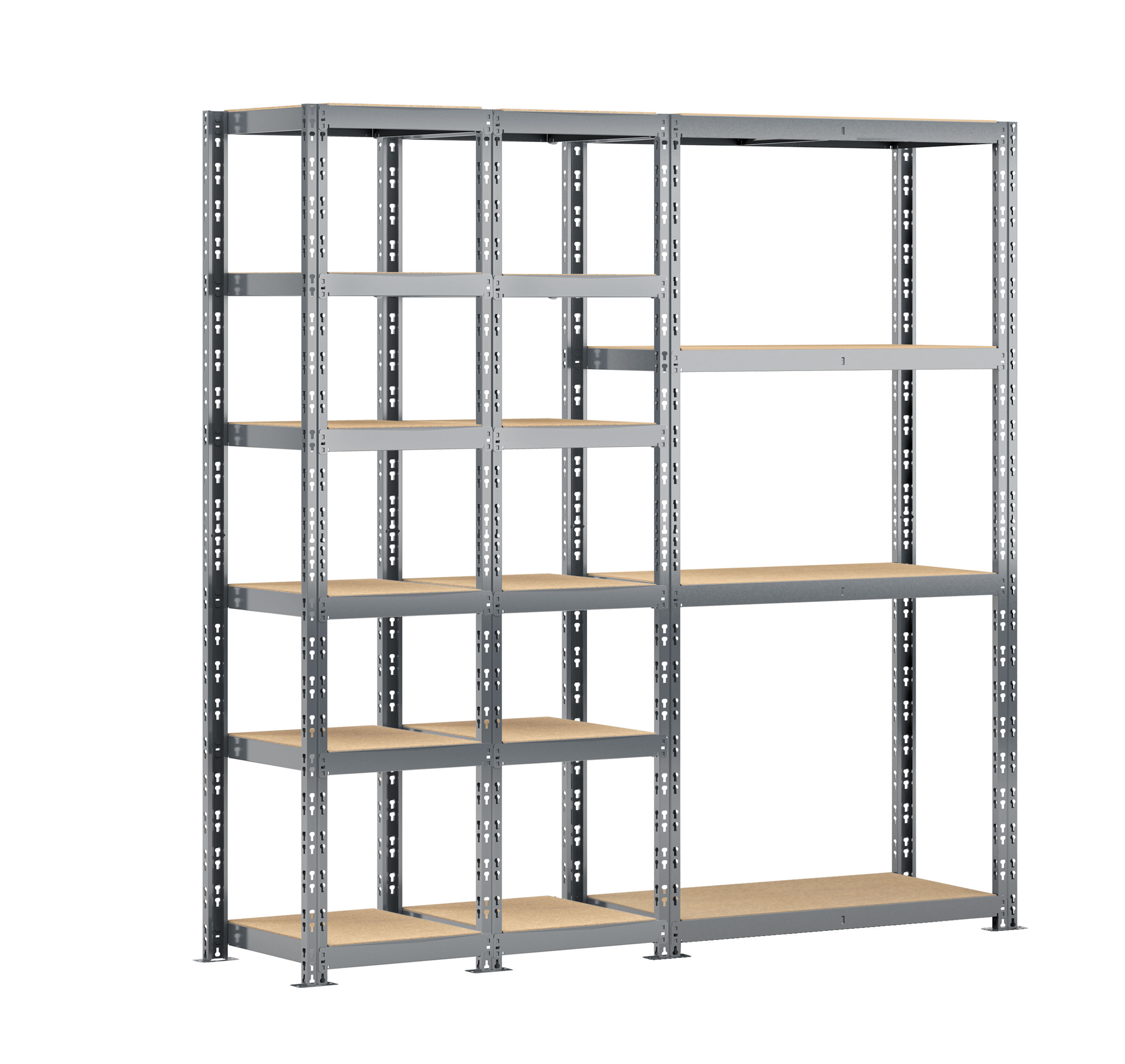 Etagère triple charge lourde 16 plateaux longueur 200 cm comprenant 2 étagères 6 plateaux 40x50xH 192 cm et une étagère charge lourde 4 plateaux 40x100xH 192 cm - Charge lourde 250 kg/plateau - Montage facile par clipsage - Finition peinture époxy