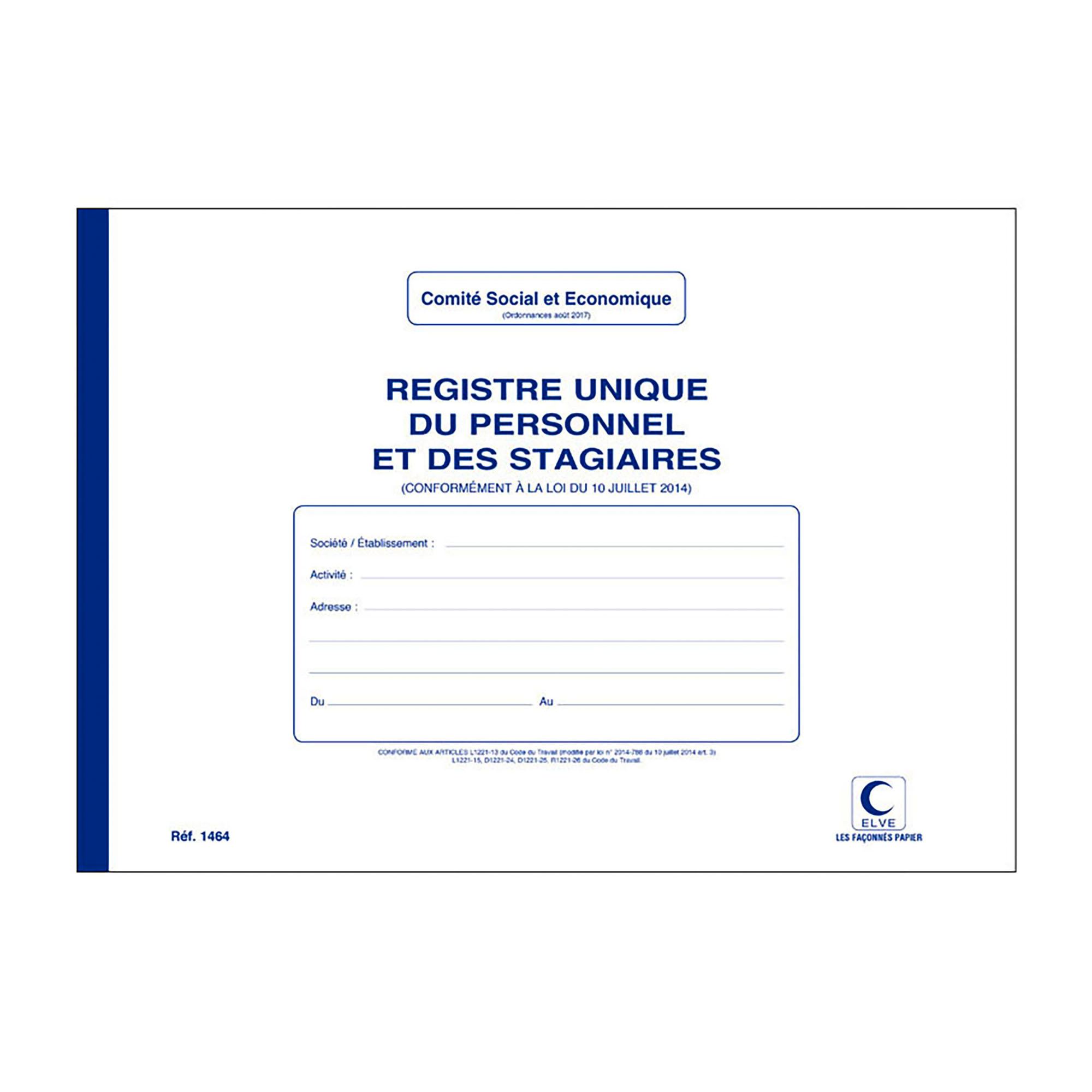 Registre unique du personnel et des stagiaires à couverture souple avec espace pour indiquer le nom de l'établissement et la durée d'utilisation du registre.