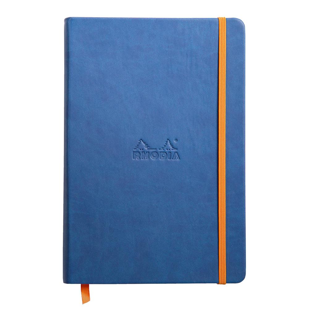 Couverture en simili cuir italien, logo Rhodia embossé, fermeture élastique orange.