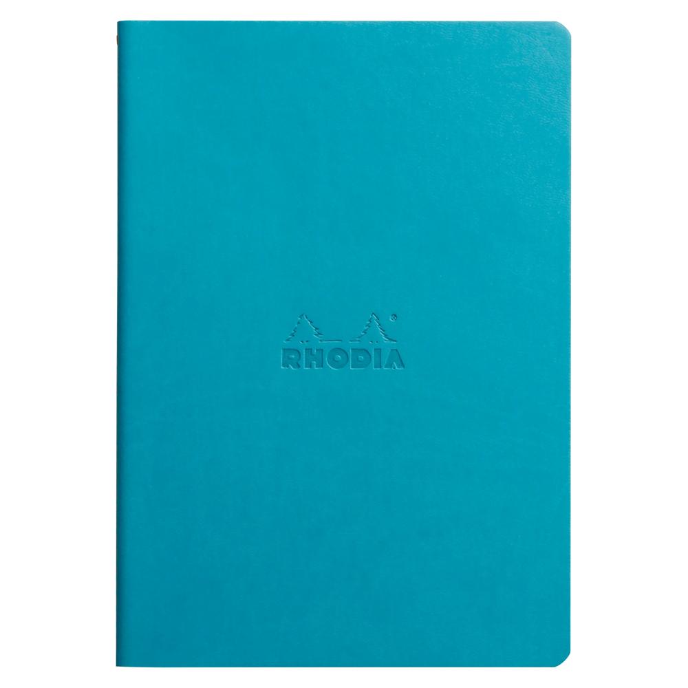 La couverture souple en simili cuir italien de ce carnet Rhodia se distingue par sa finition veloutée et sa couleur turquoise. Son design est sublimé par une piqûre textile orange, ainsi que par un logo embossé, témoignant d'un savoir-faire artisanal et de l'authenticité de la marque.