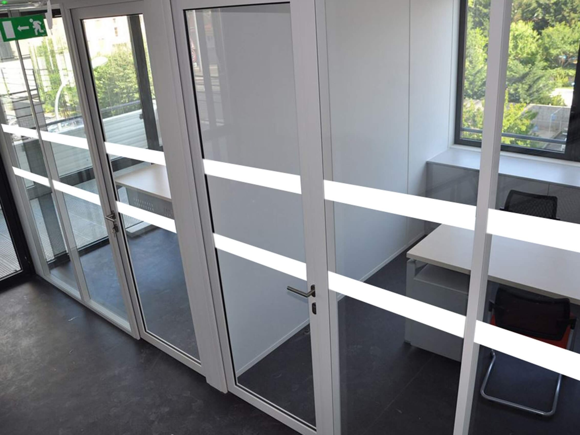 Pour le repérage et la mise aux normes de vos surfaces vitrées, Il faut disposer les deux vitrophanies horizontales(d'une largeur de 5 cm), respectivement à 1,10 m et 1,60 m de hauteur.