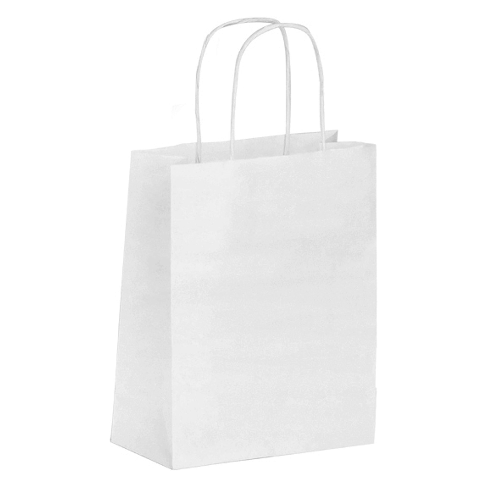 Description détailléeSac en kraft blanc avec poignées torsadéesDimensions : H 22 x L 18 x P 8 cm 90 g/m² d'épaisseur 100 % recyclable. Apte au contact alimentaire (des aliments secs et non gras à température ambiante). Résistance 5 kg. Lot de 50 sacs.