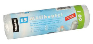Description détailléeSacs poubelle avec poignéeEn film HDPE (Polyéthylène avec une haute densité )En rouleauSacs transparents.