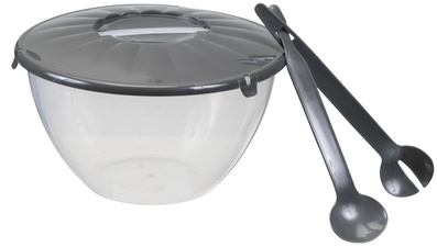 Description détailléeMatériau saladier: PPR/PPC, couverts à salade: PPH, dimensions: (L)303 x (P)303 x (H)180 mm, couvercle pratique avec poignée, fermeture à clip, lavable au lave-vaisselle, couleur: transparent / gris