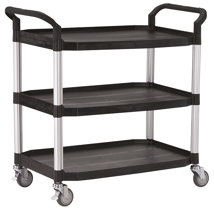 Gamme de Servantes Polyvalentes 3 grands plateaux pour Entreprises. Découvrez notre gamme de servantes polyvalentes, conçue pour répondre aux besoins exigeants des environnements professionnels. Équipées de montants en aluminium extrudé et de plateaux robustes en polypropylène et fibre de verre, elles garantissent une solidité et une durabilité optimales. Pratiques à manipuler grâce à leurs barres de poussée en polypropylène et leurs roulettes pivotantes en caoutchouc Ø100 mm, dont deux sont équipées de freins, ces servantes sont idéales pour faciliter vos opérations quotidiennes. Adaptables à divers usages, elles présentent également une haute capacité de charge, idéale pour le transport de matériaux lourds.