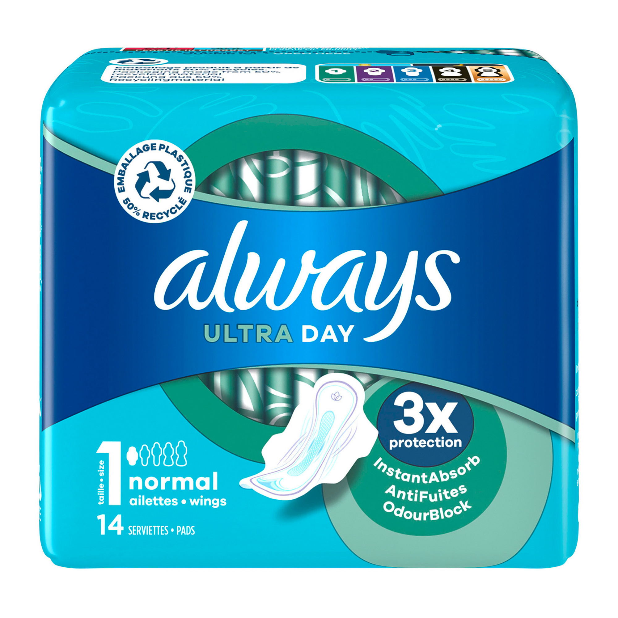 Ces serviettes Jour Normal (Taille 1) Always Ultra offrent une triple protection :