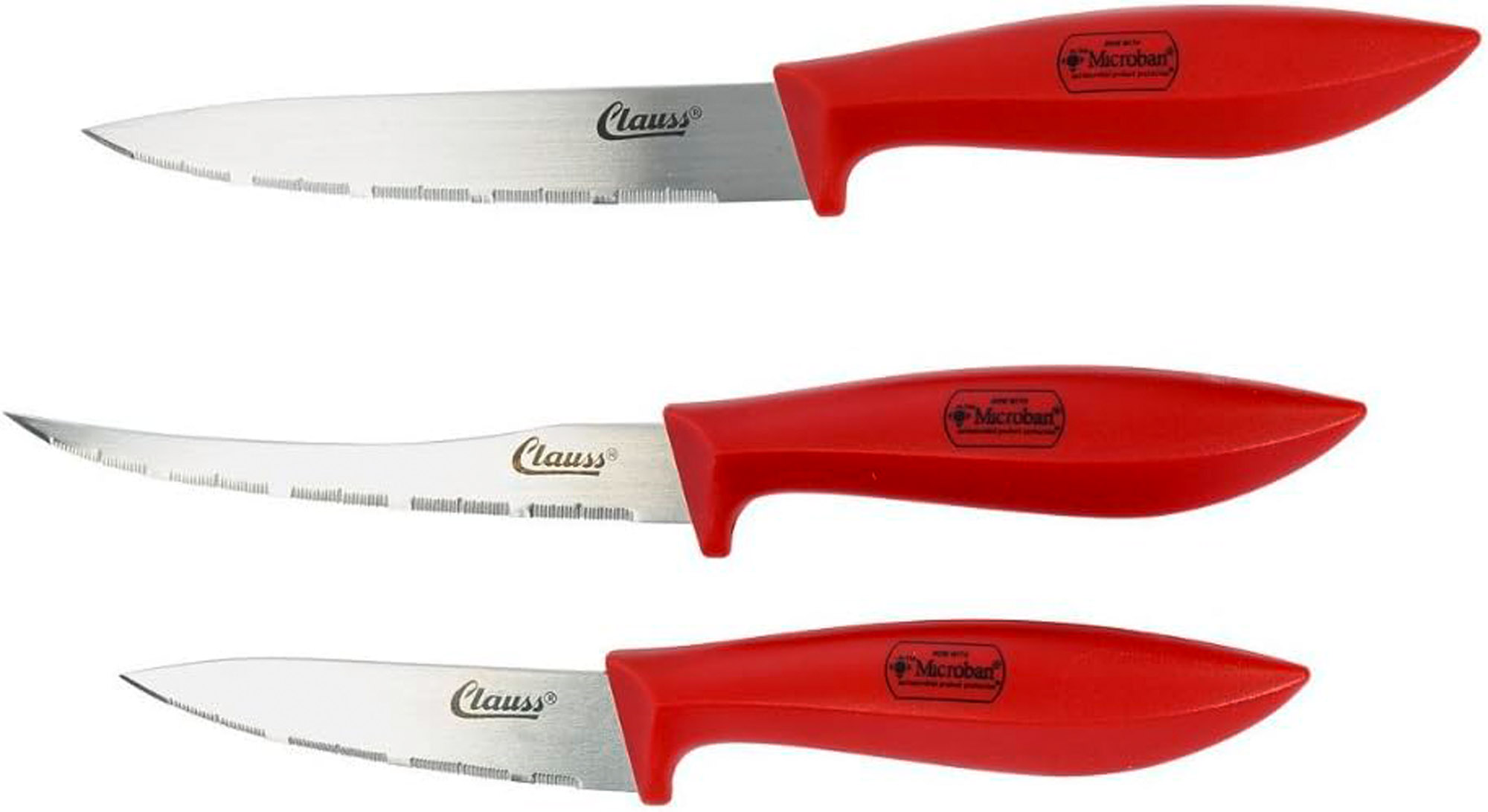 Description détailléeLes outils Clauss sont le choix des professionnels et des utilisateurs amateurs exigeants depuis 1877.Ensemble de 3 couteaux :1 couteau d´office, L 11,4, cm, 1 couteau de cuisine, L 8,9 cm1 couteau universel, L 11 cm Lames antirouille et dentelées en acier inoxydable 3Cr13/ AISI 420. Adaptés au lave-vaisselle Manche antibactérien avec Microban.