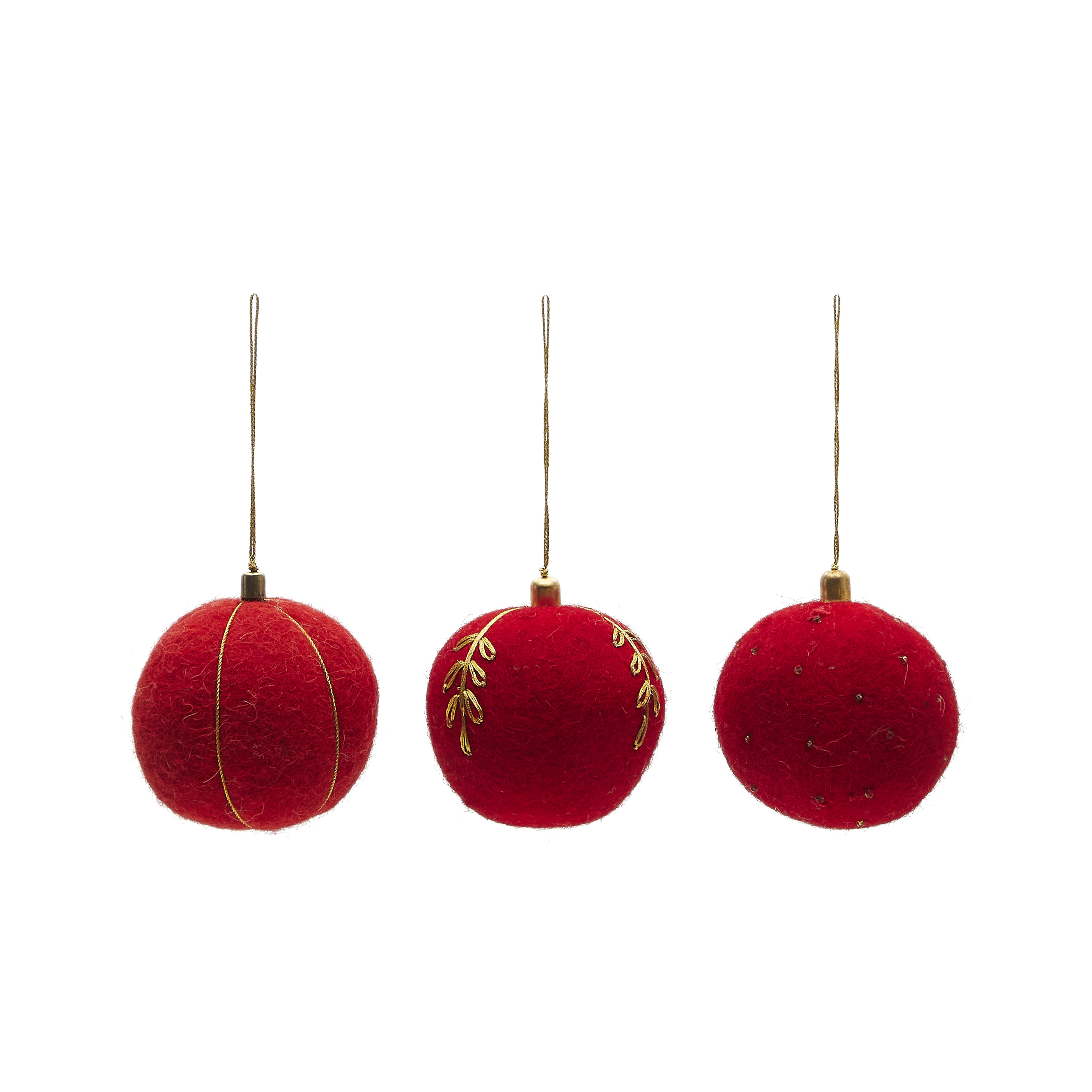 Set de 3 boules suspendues de décoration rouges avec motifs dorés.