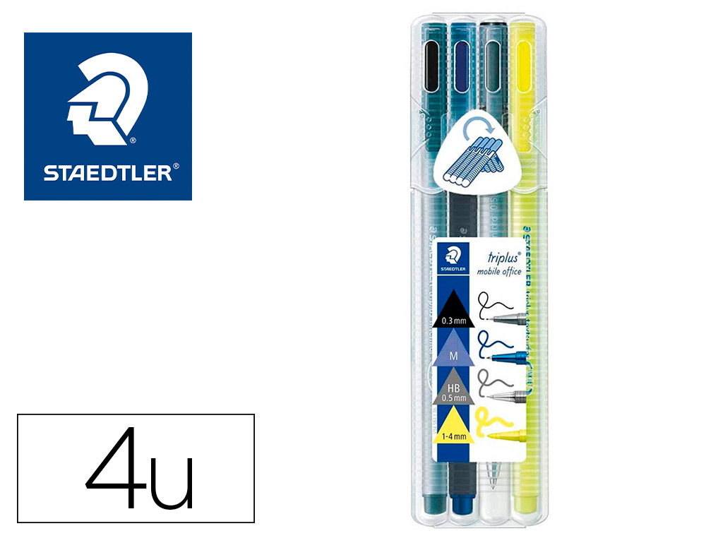 Le set se compose de quatre pièces essentielles pour s'adapter à diverses situations professionnelles. Vous trouverez un fineliner triplus noir, parfait pour la prise de notes précises et détaillées lors des réunions ou pour la rédaction de documents. Un stylo à bille triplus bleu est également inclus, offrant une écriture fluide et confortable pour un usage quotidien.