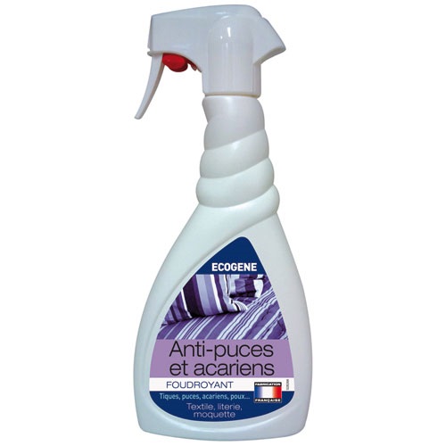 Le spray foudroyant anti-puces et acariens en 500 mL de chez Ecogène est un anti-poux et acariens conçu pour lutter efficacement contre les puces, poux, acariens qui se nichent dans les tapis, tissus, moquettes, literie. Action antiparasitaire puissante sur les puces, poux, tiques au stade de larves et adultes. A base d'agents bactéricides qui désinfectent en profondeur. Utilisez les biocides avec précaution. Avant toute utilisation, lisez l’étiquette et les informations concernant le produit.