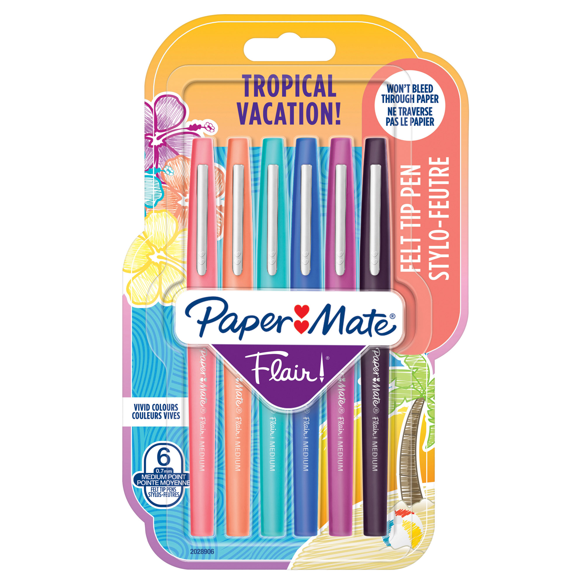 Description détailléeDécouvrez les stylos feutres Paper Mate Flair et décuplez votre plaisir d’écrire ! Une pointe moyenne pour des lignes audacieuses et expressives en accord avec votre personnalité Encre à l’eau qui ne transperce pas le papier pour que votre écriture reste intacte Résiste aux bavures et à la décoloration pour une page belle et nette Pochette de 6 stylos coloris assortis : goyave, papaye, bleu océan, bleu surf, orchidée, fruit de la passion.