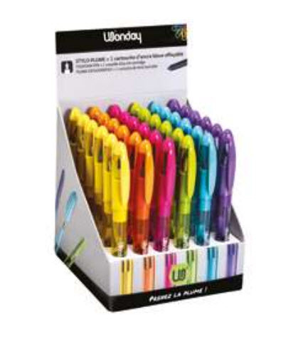 Description détailléeStylos plumeAvec une cartouche d'encre bleue.Coloris assortis : jaune, orange, rose, vert, bleu, violet.Ce produit ne bénéficie pas de la Garantie Sécurité Intégrale Bruneau. Il ne peut être ni repris, ni échangé. Ce produit est non remisable.