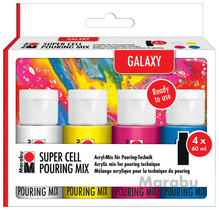 Description détailléePrêt à l'usage, mix d'acrylique, à base d'eau, set pour la technique du pouring, résiste à l'eau et à la lumière, assorti dans les couleurs: blanc, turquoise, bleu foncé, or