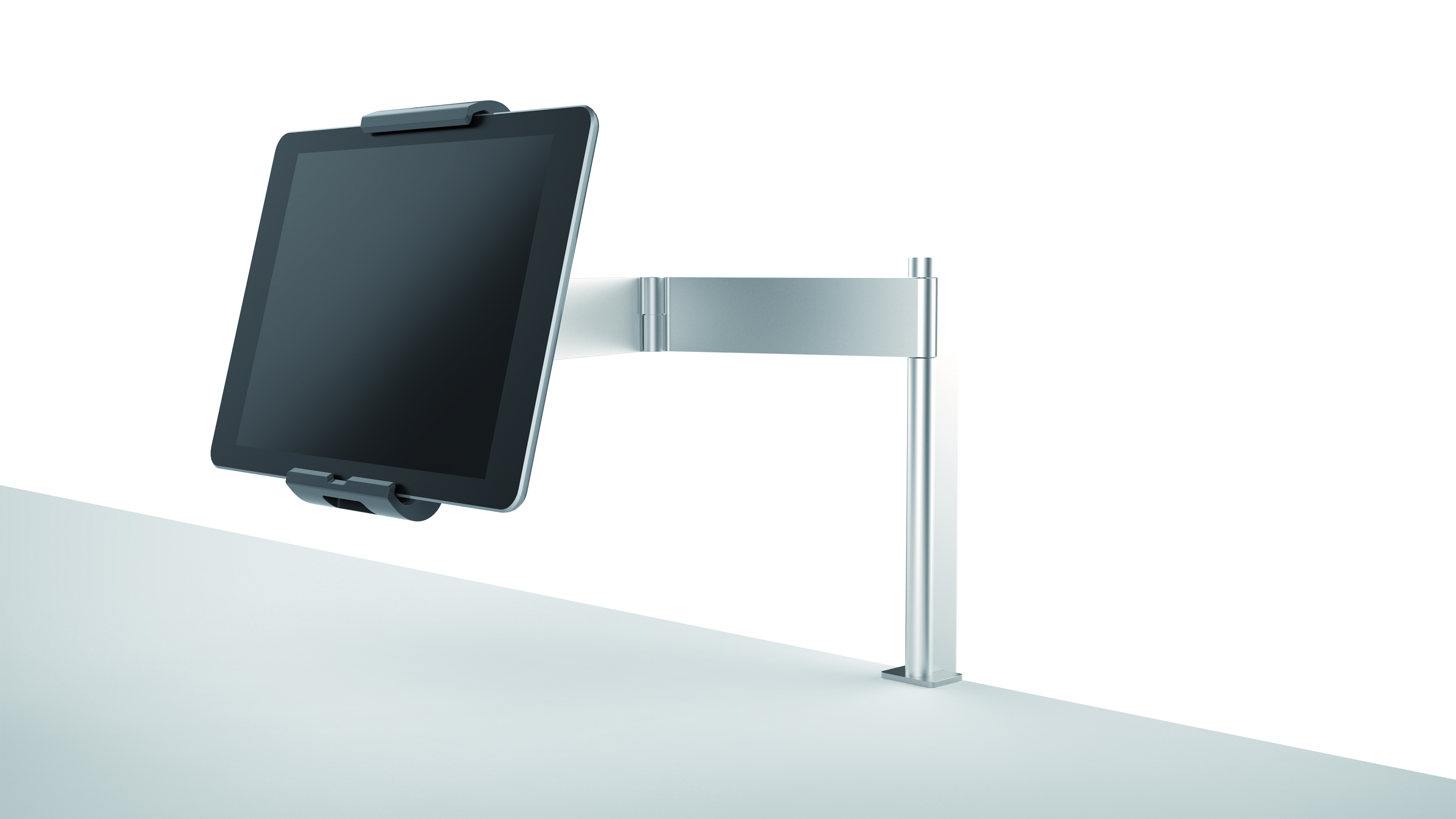 Support tablette en aluminium avec bras articulé et fixation par pince.