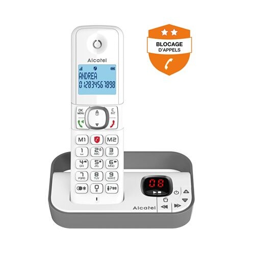 Fonction Blocage des appels publicitaires grâce à une touche dédiée (1 mode manuel et 1 mode automatique). Jusqu'à 100 appels bloqués !, Fonction répondeur simple à utiliser : - Touches d’accès sur la base et sur le combiné - Compteur de messages sur la base pour vous informer d’un seul coup d’œil de l’arrivée de nouveaux messages, Grand écran alphanumérique rétro-éclairé (1 ligne dot-matrix & 1 ligne 7 segments), Fonction mains-libres pour partager agréablement vos conversations