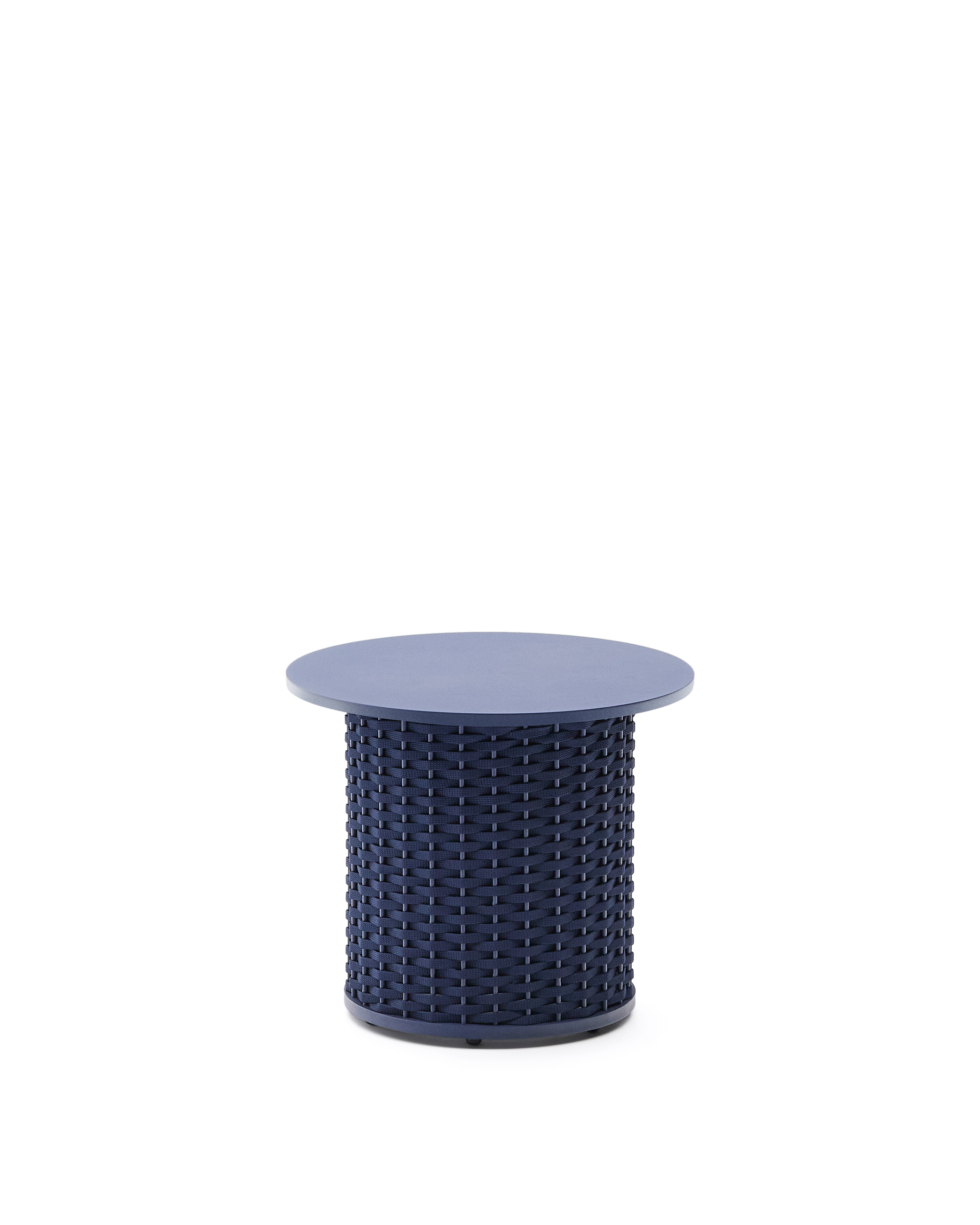 Table basse en aluminium et base en corde tressée à la main, résistante aux rayons UV et renforcée par une base en acier qui stabilise l’ensemble.