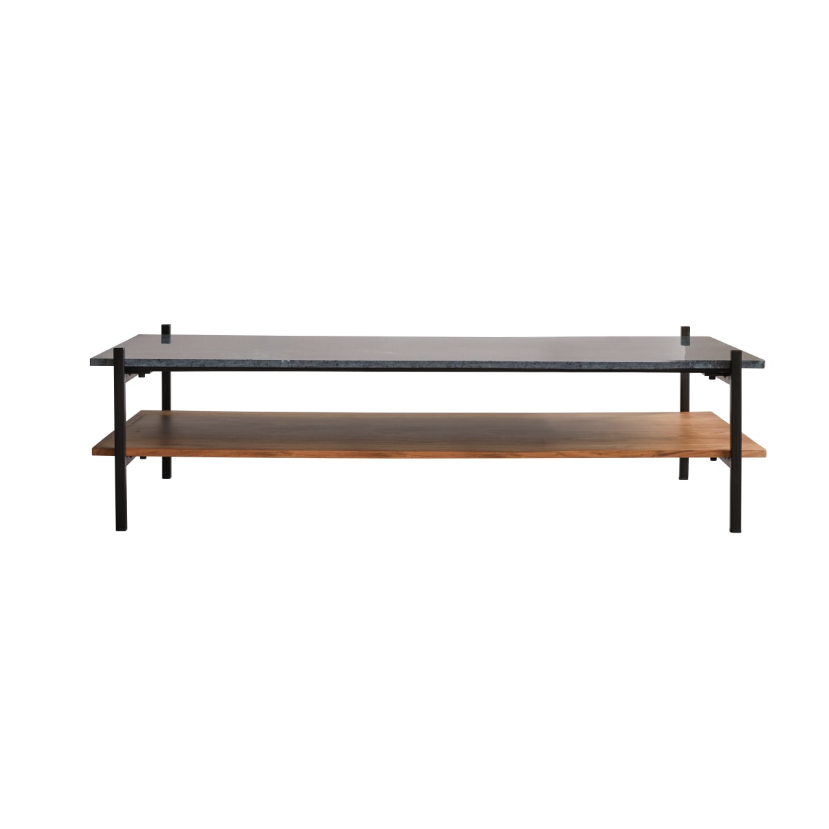 Composition : Table composée d'un plateau en acacia massif et d'un plateau en marbre vert; piètement métal.
