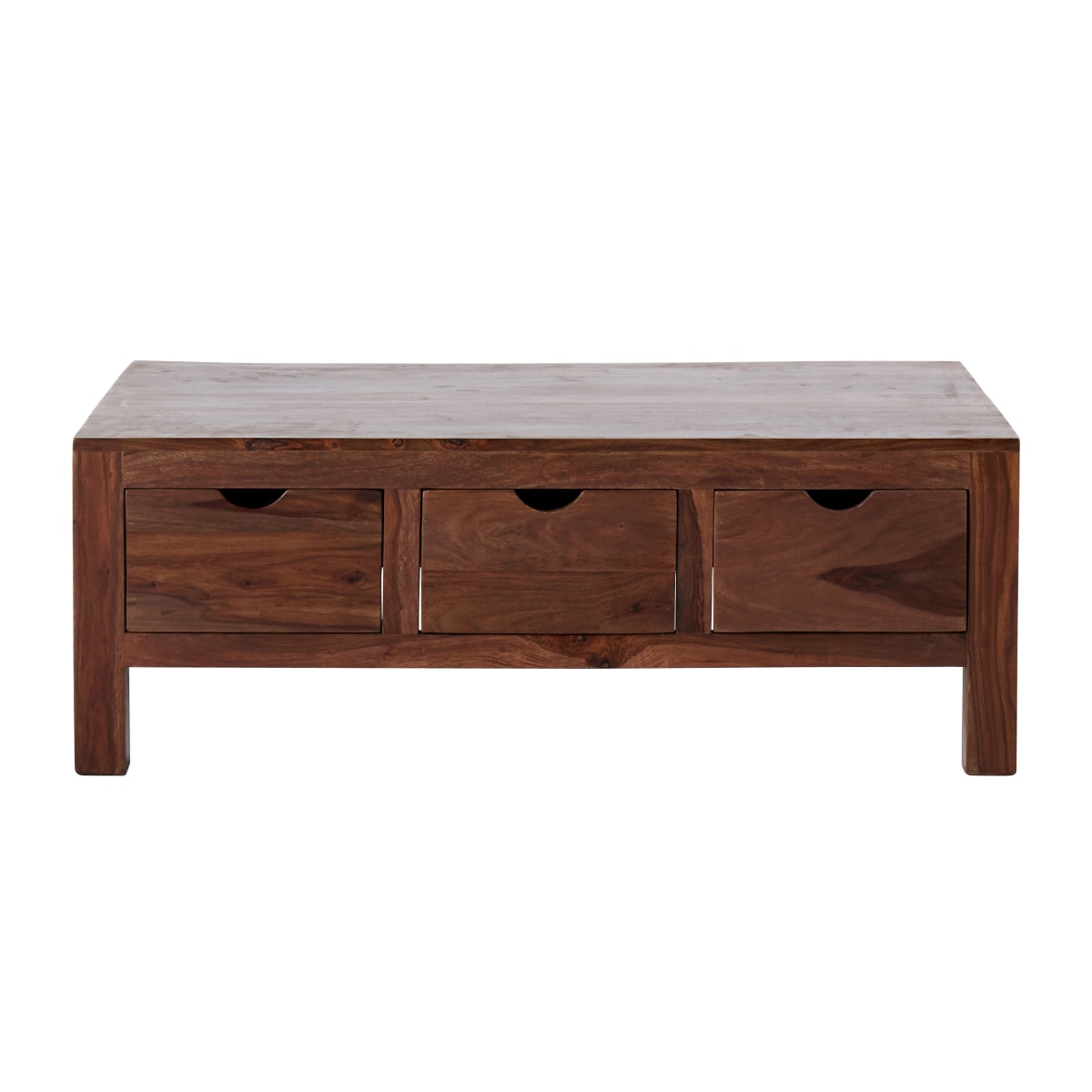 Table de salon en palissandre. Le sheesham est un bois massif au dessin chamarré, appelé également palissandre des Indes ces éventuelles irrégularités sont gage de son authenticité. 3 tiroirs de chaque côté équipés d'un système de blocage d'ouverture.