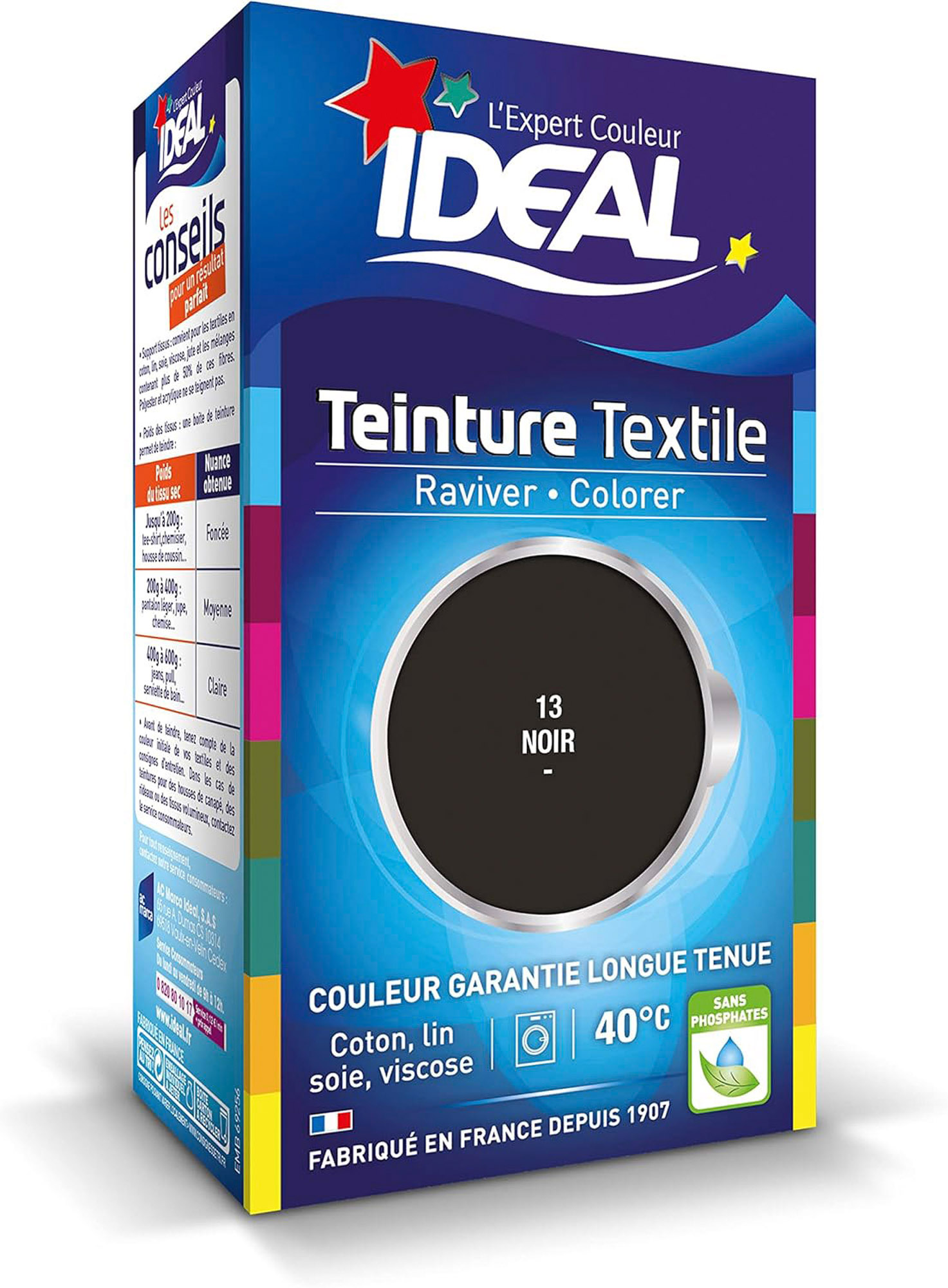 Description détailléeLa teinture liquide permet de teindre toutes les matières naturelles comme le coton, la soie, le lin, la viscose et même le jute. Elle assure une teinte uniforme et durable dans le temps. Redonner de l’intensité à votre jean de couleur foncée, apporter du peps à un t-shirt blanc basique, customiser un sac de plage…La teinture grand teint liquide 40 ml de la marque IDEAL permet de teindre jusqu'à 500 g de tissu.Cette teinture liquide grand teint peut s'utiliser directement en machine à laver.La teinture liquide IDEAL, c’est la solution pour teindre et customiser tous vos habits, accessoires et tissus d’ameublement dès 40°C.La boîte contient : 1 barquette de teinture de 40 ml + 1 barquette de fixateur 50 g.