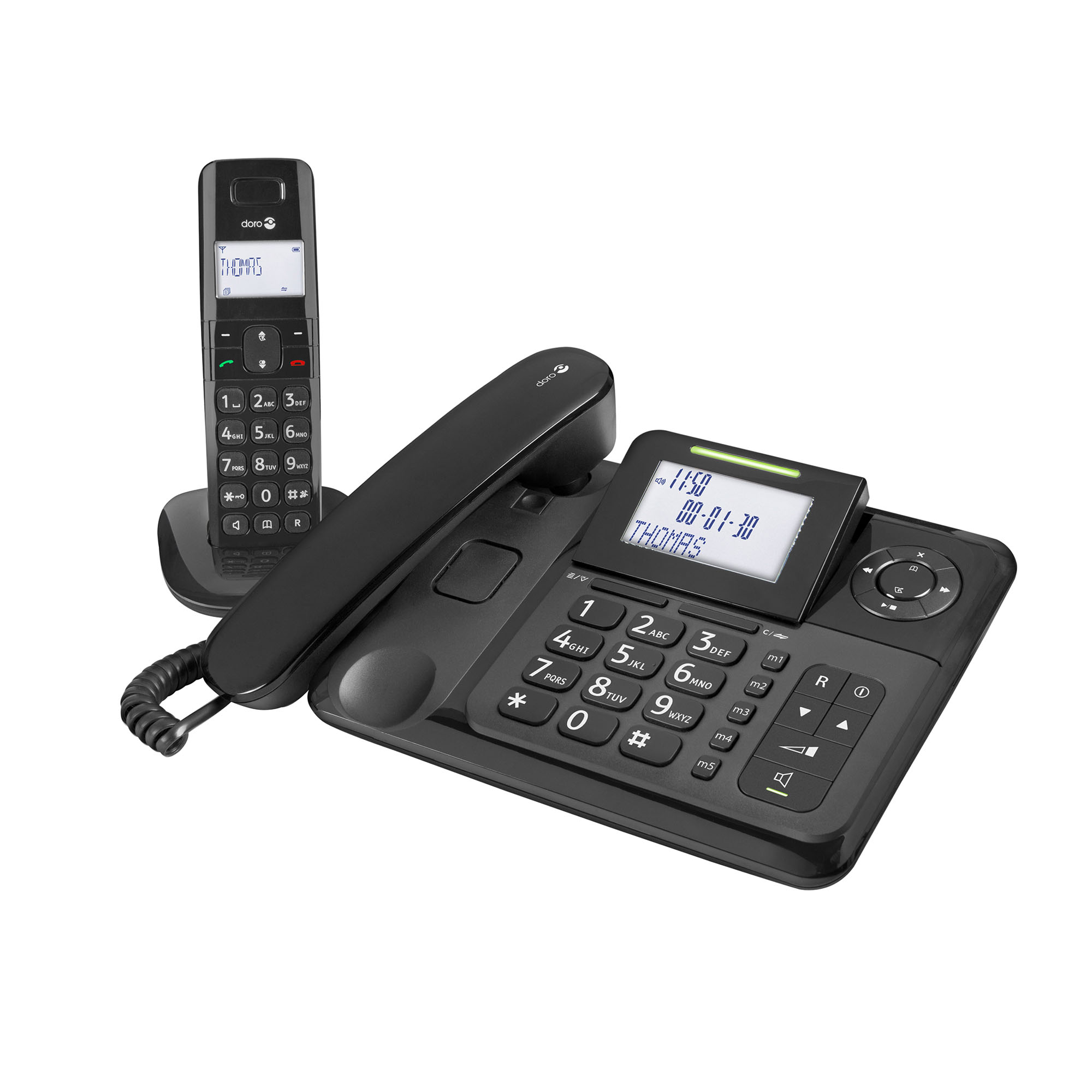 Telephone filaire avec répondeur integré et combiné sans fils . Son clair et puissant (24dB) Truesound. Afficheur rétro-éclairé blanc pour une meilleure lisibilité. Mains libres, répondeur 15 minutes avec fonction répondeur simple, annonce pré-enregistrée, horodatage des messsages. Répertoire 50 contacts. 5 mémoires indirectes. Compatible appareil auditifs. Fonctions interphonie, transfert d'appels.