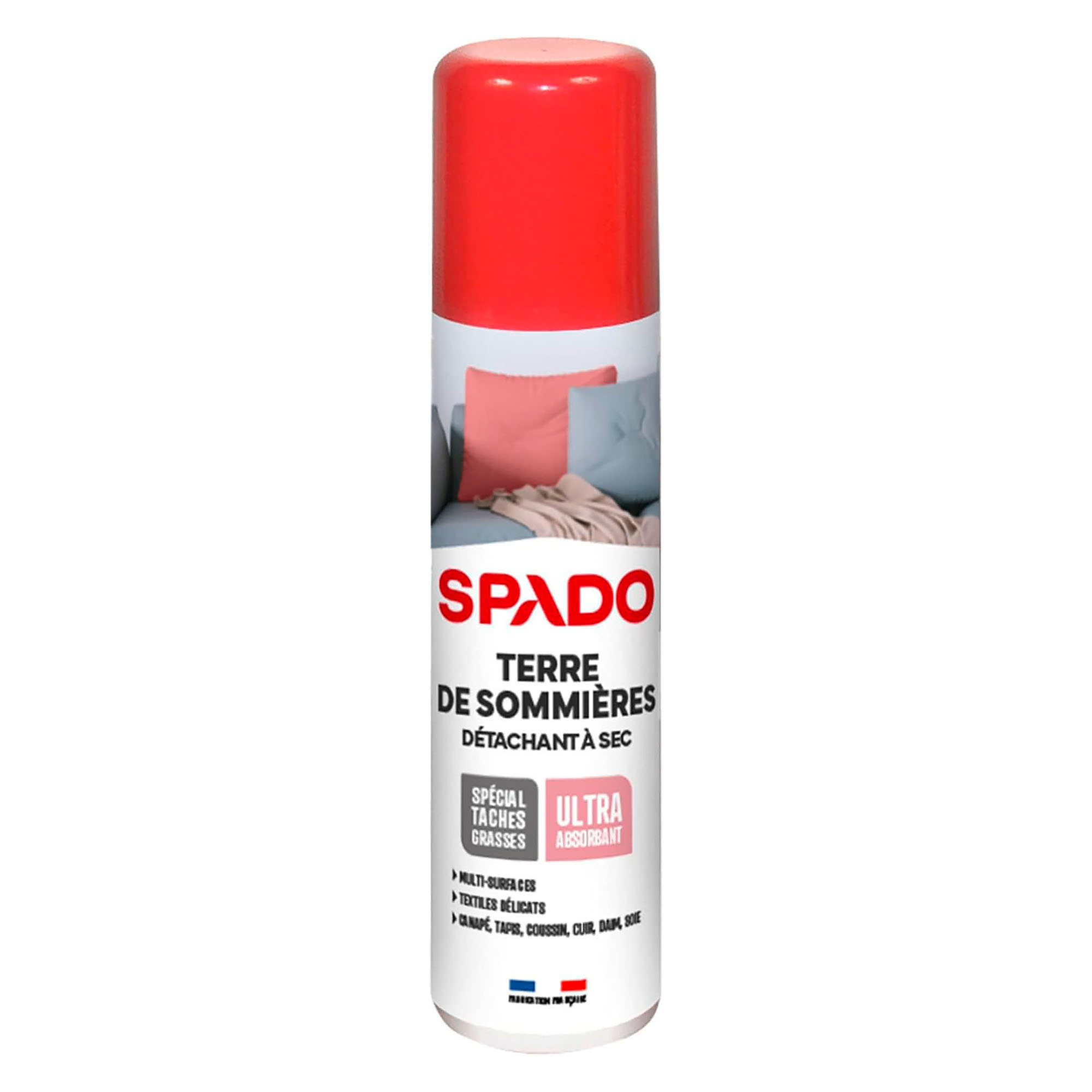 La terre de sommières détachant à sec de 75 mL de la marque SPADO est un détachant naturel efficace contre les taches de graisse et adapté à tous types de textiles même délicats, aux sols et murs, aux meubles en bois. Ce détachant naturel est très facile à appliquer grâce à son format aérosol et convient parfaitement aux tissus fragiles comme la soie, le cuir, les sols, les murs ou les meubles en bois. Grâce à sa formule unique, ce détachant agit efficacement contre les taches de gras (huile, beurre, maquillage) tout en préservant les couleurs. Le détachant SPADO ne laisse ni trace ni auréole. Conseils d'utilisation : Ce détachant s'utilise à sec. Vaporiser généreusement la zone à traiter à une distance de 30 cm. Laisser sécher et brosser ou aspirer. Argile 100 % naturelle.