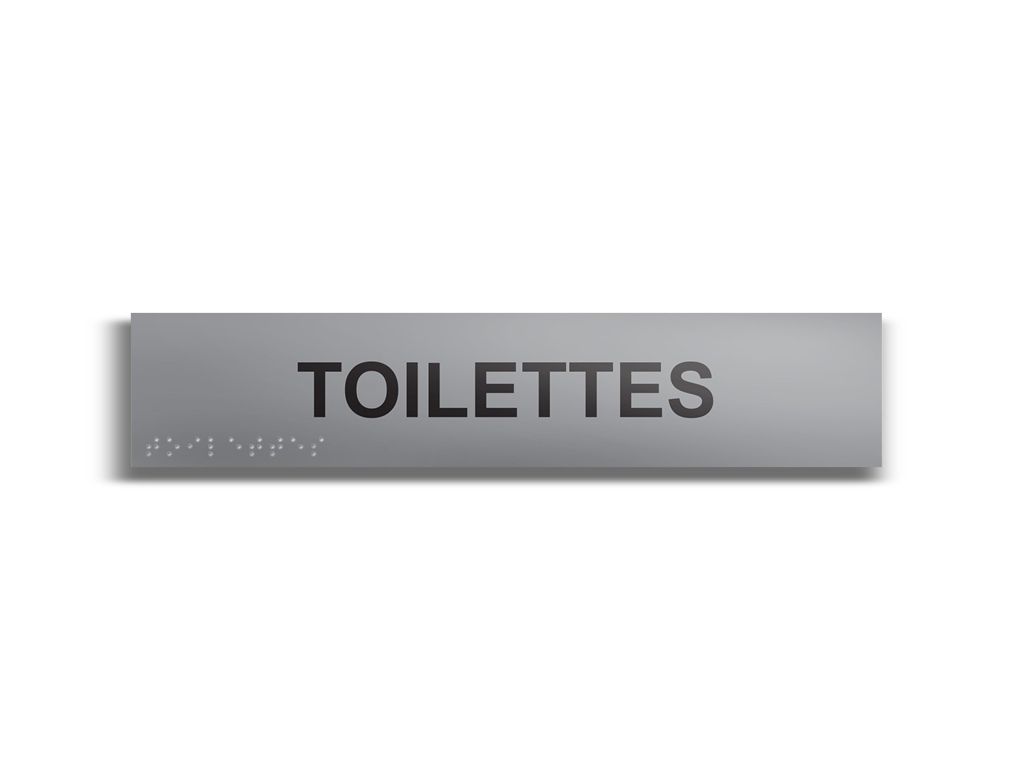 La particularité de ce produit réside dans son double marquage : le texte ""Toilettes"" est inscrit en relief et en majuscules, tandis que la traduction en Braille est assurée par l'insertion de billes en inox. Ainsi, cette plaque universelle permet une lecture aisée et rapide, tant pour les personnes voyantes que pour celles atteintes de déficience visuelle.