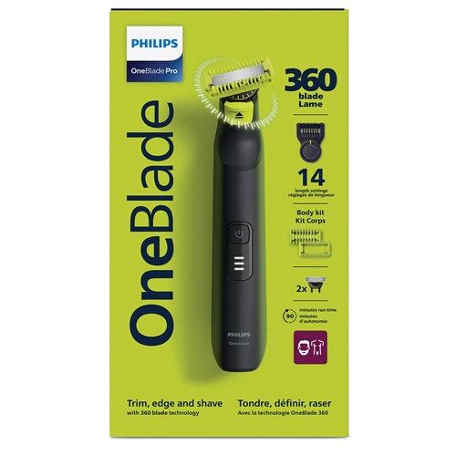 Tondeuse barbe et corps hybride : styliser, tailler et raser la barbe, même longue, Lame 360 - 14 hauteurs de coupe de 0,4 mm à 10 mm, Rechargeable - Autonomie 90 minutes - 100% étanche, Inclus : Sabot 14 hauteurs de coupe, Système de protection clipsable, Sabot corps clipsable
