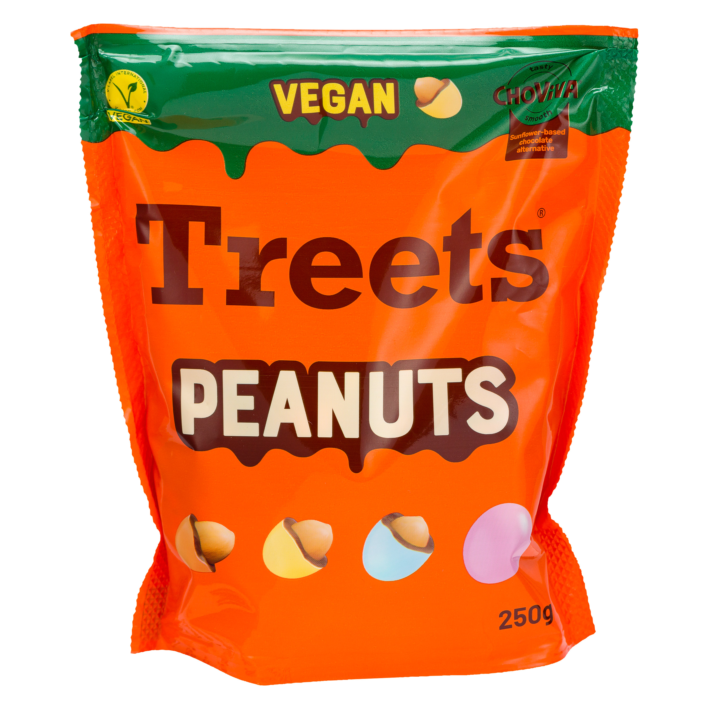 Savourez Treets Peanuts, de délicieuses cacahuètes grillées enrobées de Choviva, une alternative chocolatée innovante et respectueuse de l’environnement, le tout recouvert d’une fine couche de sucre aux couleurs pastel.