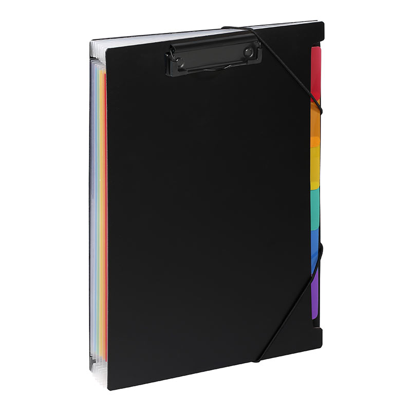 - Une pince en métal noire située sur la première de couverture, permettant de transformer ce trieur en porte-bloc pratique et fonctionnel.