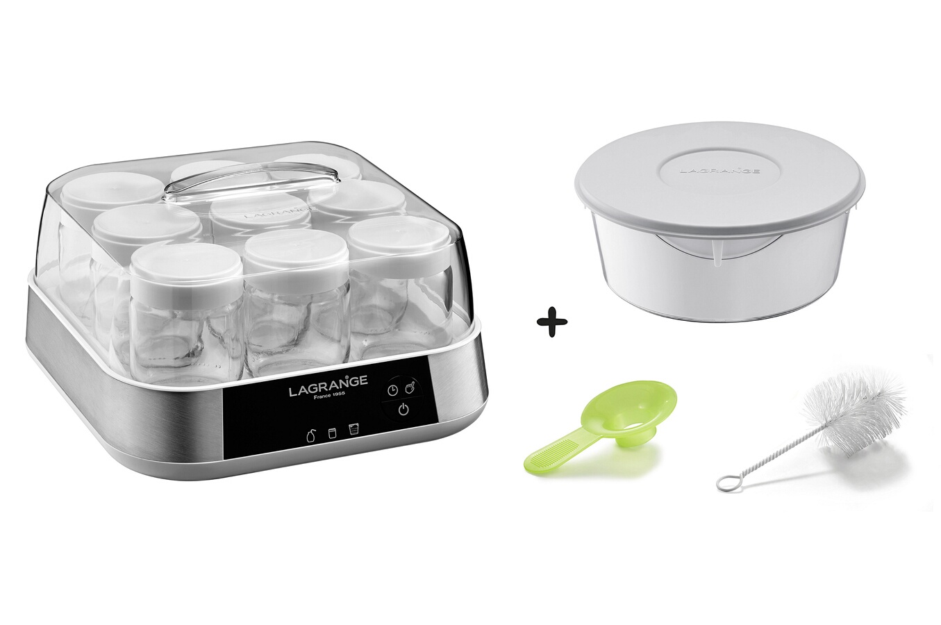 Description détaillée2 en 1: yaourtière / fromagère, Programmable jusqu'à 25 heures, Arrêt automatique avec signal sonore - Ecran LCD, Inclus : 9 pots en verre, couvercles, pot fromage blanc/skyr, couvercle souple, goupillon, entonnoir